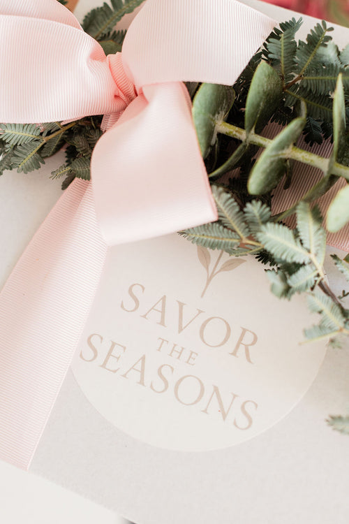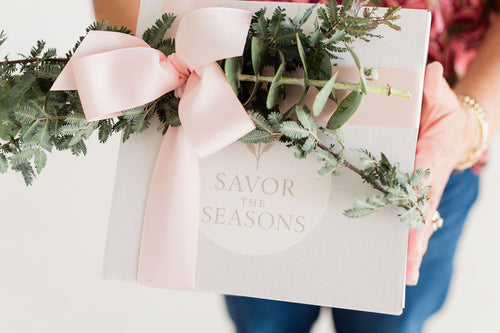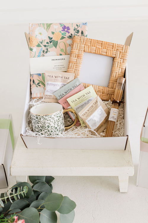 Our Spring 2026 box celebrated renewal and growth with a strawberry meadows recipe tin, glass Tulip candle, gold lined pause and place dish, handmade ceramic bud vase, homemade biscuit recipe card, and Seeds of Hope devotional.